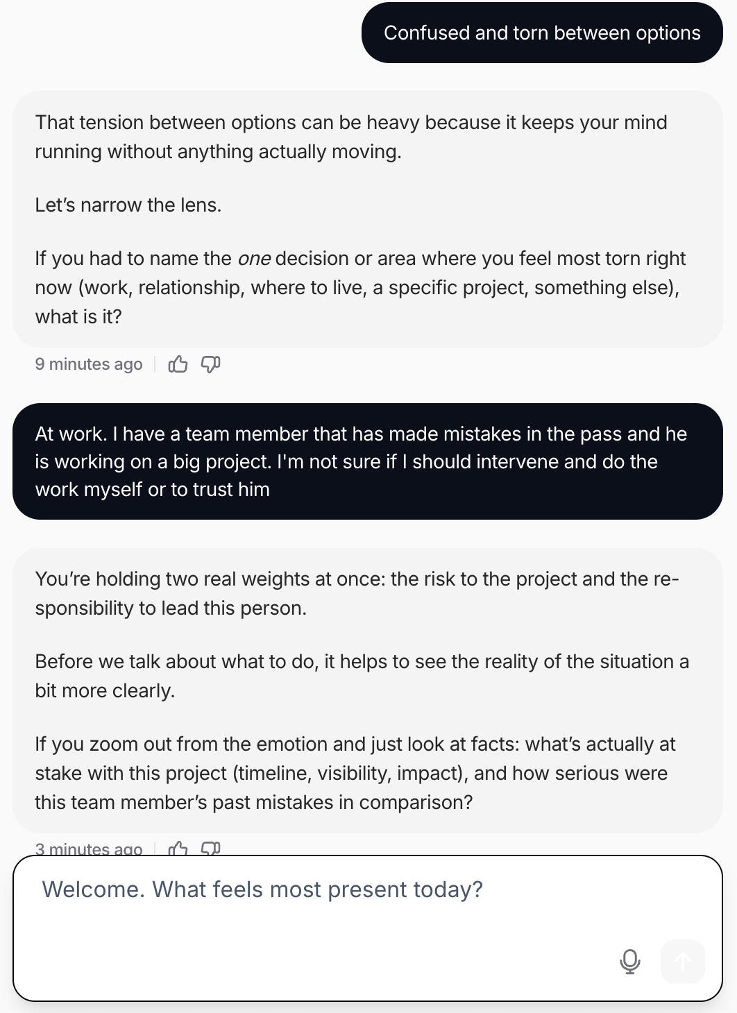 Dash doesn’t tell you what to do.Instead, it helps you think.Through thoughtful questions and structured reflection, Dash helps you slow down, challenge assumptions, and uncover what actually matters in your situation.It’s like having a calm, objective thinking partner whenever you need one.